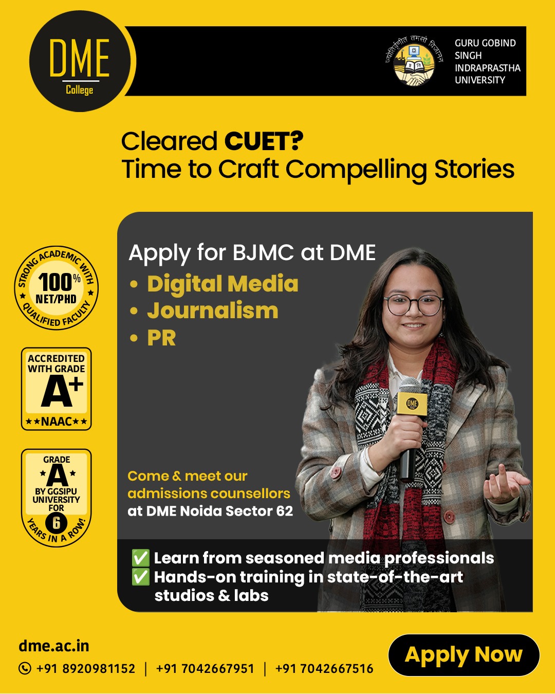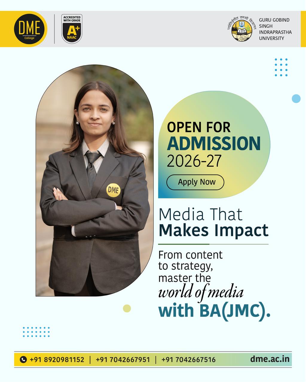 DME is affiliated to Guru Gobind Singh Indraprastha University (GGSIPU), New Delhi, and is approved by the Bar Council of India (BCI) for its law programmes.