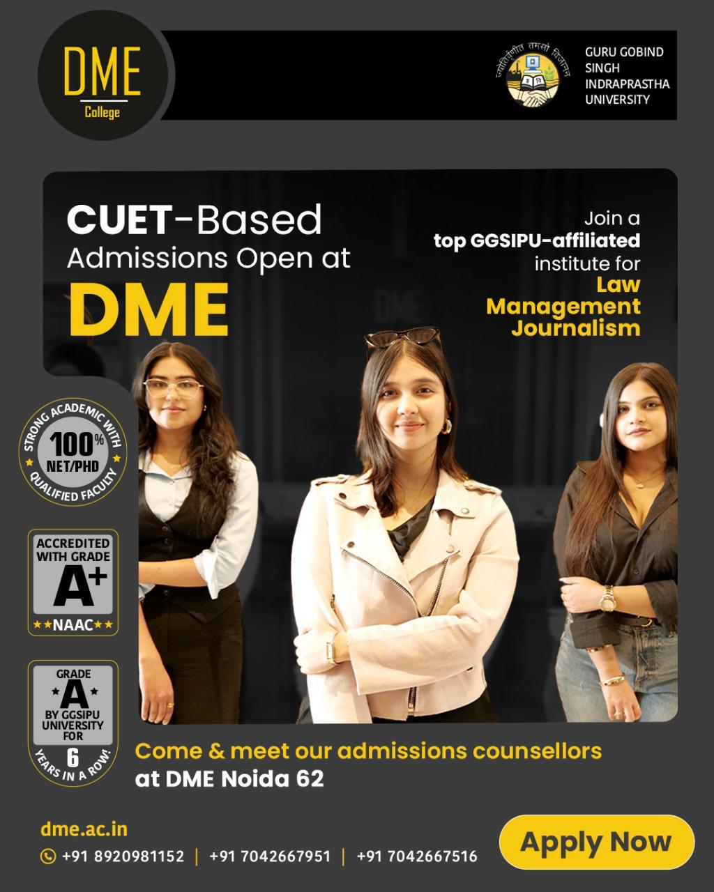 DME is affiliated to Guru Gobind Singh Indraprastha University (GGSIPU), New Delhi, and is approved by the Bar Council of India (BCI) for its law programmes.
